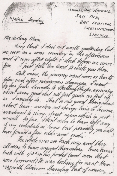 His next stop was No.14 Operational Training unit at Market Harbourough, and then on to 51 Base at RAF Swinderby a heavy conversion unit, then 1654 Conversion Unit, but he was eventual sent to the No.5 Lancaster Finishing School at RAF Syerston. It was from here he was posted to 50 Squadron at RAF Skellingthorpe on 24th March 1944 (According to the squadron ORB). By this time the full crew had been made up, the crew being;